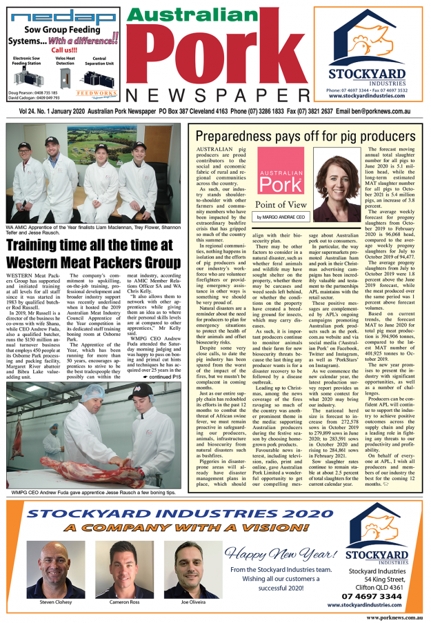 January 2020 edition headlines Training time all the time at Western Meat Packers Group Preparedness pays off for pig producers Producer consultations for APIQ’s Major Review APL down in the…