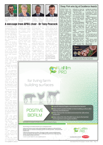 www.porknews.com.au Australian Pork Newspaper, October 2024 %u2013 Page 11TOGETHER with Australian Pork Limited, Australasian Pork Research Institute Ltd have just announced that their Chief Executive, Dr John Pluske, has taken on the role of Chief Scientist for the Australian Pork Industry.John will become a Director of Australian Pork Limited and the Australasian Pork Research Institute.As Chief Scientist, he will ensure coordination of the research and development effort across both organisations.He will also have carriage of the annual %u2018Green Paper%u2019 process which captures the major issues affecting our industry.John has successfully led APRIL since it took over from the Pork CRC.He is an internationally renowned scientist and commands the support of the industry, which he has served for over 30 years.The idea of a chief scientist for the industry has been discussed in the past but the opportunity to put such a position in place has proved elusive until now.The Boards and management staff of APL and APRIL already work closely together, but greater coordination and strategic alignment are always welcome.John%u2019s long association with the industry, his scientific standing and his formal role as a director of both companies puts him in a potent position to ensure the research and development funded by the industry is most effective.John will report jointly to the chair of APL, Andrew Baxter, and chair of APRIL, Dr Tony Peacock.The directors and staff of APRIL and APL should be thanked for pulling together this historic new arrangement.In other changes, Dr Charlie Rikard-Bell will step up to be the Executive Officer for APRIL.In that role, Charlie will assume the day-today management and operation of APRIL, including taking charge of investment rounds and continue critical commercialisation duties.I have already worked closely with Charlie on the AusScan Board and look forward to working together with him on the whole APRIL program.Geoff Crook has stepped down as our Company Secretary and finance manager.Geoff has been a critical link between the Pork CRC and APRIL.The APRIL finances and Board papers are always first rate and Geoff%u2019s long service to the industry never seems to get the acknowledgement and thanks it deserves.Geoff will continue to be available on some contracting matters, which is very welcome.Sally Vardy has been appointed as Company Secretary and finance manager.Sally and I worked together previously at the Cooperative Research Centres Association, and she has several CRCs as clients in her accounting practice.APRIL continues our services arrangement with APL, and I see the professionalism of Kelly Goh every month as she chases my missing receipts.There will be a period of settling into the new arrangements and I expect further changes down the track will be needed to ensure proper management and project oversight.As always, APRIL is very grateful to our students and research community and those who support them.The Australian pork industry is sciencedriven and relies on the efforts of our researchers to stay competitive and to produce the safest, highestquality products. Dr Tony PeacockAustralasian Pork Research Institute Ltdfor living farm building surfaces A specific blend of highly concentrated live bacteria Helps install a positive biofilm on farm building surfaces after cleaning and disinfectionHelps improve the microbial environment for safe animal production Helps reduce the risk of health issues due to the harmful microorganisms and negative biofilms.POSITIVE BIOFILMPartnering in microbial solutions for a changing world.Using sound science, proven results and knowledge from experience, Lallemand Animal Nutrition helps our customers and industry partners be more successful %u2013 and animals lead healthier lives.Lallemand Animal Nutrition provides a full range of specific, natural microbial products, services and solutions that improve animal wellbeing and performance while respecting animals, people and the environment.Not all products are available in all markets nor associated claims allowed in all regions.Contact us on (07) 5451 0125 | LAN-Aus@lallemand.comA message from APRIL chair - Dr Tony PeacockDr Charlie Rikard-Bell will step up to be the Executive Officer for APRIL.John Pluske has taken on the role of Chief Scientist for the Australian Pork Industry.Geoff Crook has stepped down as Company Secretary and finance manager.Sally Vardy has been appointed as Company Secretary and finance manager.OTWAY Pork%u2019s Tra- ditional Ham has taken out the Cham- pion%u2019s trophy at the prestigious Aus- tralian Charcuterie Excellence Awards.The award was presented at the Australian Meat Industry Council%u2019s annual ceremony in Sydney recently, where Otway Pork won the top gong for its traditional ham, as well as a gold medal for its shortcut bacon and a silver medal for its streaky bacon.The champion%u2019s trophy marks a significant achievement for the Otway Pork team, which has consistently set the standard for Australian charcuterie.Otway Pork CEO, Duncan Parry, said the win for the ham, along with the medals for both shortcut and streaky bacon, was a clear recognition of the team%u2019s commitment to delivering superior quality and taste through an ethical, sustainable approach to farming - hallmarks of what the company proudly calls %u2018The Otway Way%u2019.%u201cTo be named the best boneless ham and take out three medals is a testament to the passion and expertise of our entire team,%u201d Mr Parry said.Mr Parry highlighted the significance of the awards in the face of quality competition, with more than 830 entries across 35 categories.%u201cThe Australian Charcuterie Excellence Awards are highly competitive, and to be recognised at this level is an incredible honour,%u201d he said.%u201cWe were also really pleased to see a number of our partners - butchers and smallgoods producers who use Otway Pork to produce their fine food products - r