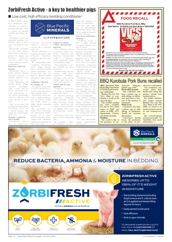 Page 12 %u2013 Australian Pork Newspaper, October 2024 www.porknews.com.auA HEALTHY, clean, and productive environment in intensive housing and pig stalls is critical for animal welfare and farm success.ZorbiFresh Active, an advanced bedding conditioner, offers a powerful cost-effective solution.Specifically designed for pig stalls, ZorbiFresh Active is the go-to product for disease and bacterial reduction, moisture control, ammonia reduction and fly management.Bacterial control for hygieneZorbiFresh Active is highly effective against harmful bacteria, including Staphylococcus aureus and E. coli.Upon application, the product begins killing bacteria, pathogens, fungi, viruses and fly larvae, providing constant antibacterial action which significantly improves hygiene and lowers the risk of infections.Used at the same rate as European alternatives, ZorbiFresh Active has a similar efficacy and comes at a significantly lower cost.Moisture control for better healthZorbiFresh Active has an exceptional moisture absorption capacity, playing a crucial role in keeping stalls dry.Excess moisture in bedding can lead to skin infections, respiratory problems and poor hoof health.By maintaining drier conditions, ZorbiFresh Active helps prevent these moisture-related health challenges, ensuring that pigs are kept in optimal health throughout their growth cycle.Ammonia reduction for cleaner airAir quality in pig stalls is directly affected by increased ammonia levels, due to animal waste.ZorbiFresh Active contains a unique combination of natural zeolite and oxone, which together absorb ammonia and nitrates.By preventing ammonia from converting into ammonium, fresher, cleaner air is maintained, respiratory issues reduced and a healthier working environment for staff is provided.Enhanced animal welfare and farm productivityThe combined effects of moisture control, ammonia reduction and bacterial management result in a healthier, more comfortable living environment for pigs.This translates to several benefits for farm operations.Healthier pigs are less stressed, suffer fewer respiratory problems, veterinary costs will be reduced and feed efficiency will improve.Odour and fly managementZorbiFresh Active has the ability to neutralise unpleasant odours.Its moisture-absorbing properties combined with ammonia control help minimise strong smells, improving the comfort of farm workers and helping farms meet environmental regulations.ZorbiFresh Active also plays a role in managing flies.By creating a drier, low-ammonia environment, the product reduces fly populations.For even more effective fly management, ZorbiFresh Active Plus offers enhanced features to tackle this issue.Ease of use and labour efficiencyZorbiFresh Active is easy to apply, making it a labour-efficient solution for farms.For all types of bedding material, the product integrates seamlessly.The recommended application rate is 50g to 100g per square metre every week for disease prevention, depending on the moisture level and condition of the pen.Higher usage rates apply for disease mitigation.ZorbiFresh Active is a comprehensive bedding solution that improves both animal welfare and farm efficiency by addressing moisture control, ammonia reduction, bacterial control, odour and fly management.For farmers looking to boost productivity, reduce veterinary costs and ensure healthier livestock, ZorbiFresh Active and ZorbiFresh Active Plus offer a smart, effective solution that%u2019s harmless to both animals and humans.For more information, contact paul.buffey@bpmnz.co.nz ACTIVEActively enhance animal beddingREDUCE BACTERIA, AMMONIA & MOISTURE IN BEDDINGNON TOXICFOR USE IN BEDDINGHEALTHY LIVESTOCKODOUR REDUCINGZORBIFRESH ACTIVE ABSORBS UP TO 199% OF IT%u2019S WEIGHT IN MOISTURETO ORGANISE SAMPLES OR A QUOTE CALL PAUL ON 0400 006 065 OR EMAIL PAUL.BUFFEY@BPMNZ.CO.NZ%u2022 Starts killing bacteria (including Staph aureus and E. coli) as soon as it is applied and keeps killing beyond 24 hours%u2022 Easily spread across pens%u2022 Cost effective%u2022 Kind on your animalsZorbiFresh Active - a key to healthier pigsn Low cost, high efficacy bedding conditionerCustomers should return products to place of purchase for a full refund.BBQ Kurobuta Pork Buns 480g, best before 5/12/2024 and best be- fore 19/02/2025.Birchan Pty Ltd T/A Vic%u2019s Meat is conducting a recall of the above product.The recalled product has been available for sale in Vic%u2019s Meat stores in NSW and online in NSW, ACT, Queensland, Victoria and South Australia.ProblemThe recall is due to the presence of undeclared allergens (gluten, egg, milk).Food safety hazardAny consumers who have a gluten, egg or milk allergy or intolerance may have a reaction if the product is consumed.What to doConsumers who have a gluten, egg, or milk allergy or intolerance should not consume this product.Consumers should return the product(s) to the place of purchase for a full refund.Any consumers concerned about their health after eating this product should seek medical advice.For further information, please contact Birchan Pty Ltd T/A Vic%u2019s Meat on 02 9317 6900, via email at online@vicsmeat.com.au or visit vicsmeat.com.auSee www.foodstandards.gov.au/recalls for Australian food recall information. BBQ Kurobuta Pork Buns recalled