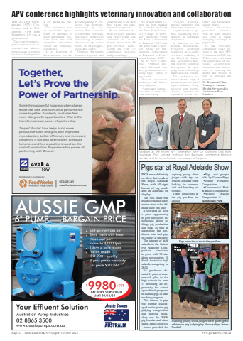 Page 14 %u2013 Australian Pork Newspaper, October 2024 www.porknews.com.auTHE 2024 Pig Veterinarians (APV) Conference held in Wollongong, NSW, from September 4-6 was a great success.The event brought together veterinarians, researchers and industry professionals to explore the latest developments in pig health and welfare.The conference was an invaluable opportunity for attendees to share knowledge, generate fresh ideas and strengthen connections within the veterinary community.A key highlight of the conference was the keynote address by Professor Eric Burrough, sponsored by Australian Pork Limited, a renowned veterinary diagnostic pathologist specialising in enteric diseases of pigs, with a focus on Brachyspiraassociated colitis.Professor Burrough%u2019s extensive expertise and contributions to the field have earned him international recognition.He has delivered lectures at major national and global events and authored or co-authored more than 80 peer-reviewed manuscripts and over 175 conference abstracts and proceedings.His distinguished career has been marked by accolades, including the Iowa State University College of Veterinary Medicine Award for Early Achievement in Research (2013) and the Iowa State University Award for Outstanding Achievement in Extension or Professional Practice (2023).At the APV Conference, Professor Burrough delivered four key presentations covering topics central to pig health:%u2022 Porcine respiratory pathology and laboratory diagnosis %u2022 Aggregated diagnostics data in swine disease monitoring %u2022 Porcine gastrointestinal pathology and laboratory diagnosis %u2022 Applications of genetic sequencing technologies in veterinary diagnostics.In addition to his keynote presentations, Professor Burrough conducted an in-depth, two-hour workshop at the Elizabeth Macarthur Agricultural Institute on gross pathology descriptors, the sampling process, histology slides and case studies.The conference featured a diverse range of presentations on critical topics, including Streptococcus equi zooepidemicus, Japanese encephalitis, swine dysentery and Salmonella, among others.These discussions provided attendees with the latest insights and tools to tackle emerging challenges in pig health.As the veterinary community looks forward to the next APV Conference in 2025, the 2024 event reaffirmed the importance of continued collaboration, education and innovation in ensuring the health and welfare of pigs in Australia and beyond. Dr Raymond Chia, Manager, Animal Health StewardshipAustralian Pork LimitedTogether,Let%u2019s Prove thePower of Partnership.Distributed in Australia by:Something powerful happens when shared expertise, care and nutritional performance come together. Suddenly, obstacles feel more like growth opportunities. That is the transformational power of partnership.Zinpro%u00ae Availa%u00ae Sow helps build more productive sows and gilts with improved reproduction, better efficiency and increased longevity. It has also been shown to reduce lameness and has a positive impact on the cost of production. Experience the power of partnering with Zinpro%u00ae.03 5429 2411www.feedworks.com.auAPV conference highlights veterinary innovation and collaborationNotables at the recent APV conference were Dr Raymond Chia from Australian Pork Limited, Professor Eric Burrough, conference keynote speaker and Dr Yvette Pollock, veterinarian at Sunpork.PIGS were definitely on show last week at the Royal Adelaide Show, with all eight breeds of pig available in Australia on display.The APL team was excited to host an information stand at the Adelaide show this year.It provided us with a great opportunity to give showgoers information about all things pig production and pork, as well as supporting the producers who had pigs on display at the show.The interest of high schools in the School Pig Handling Competition continues to grow with 90 students representing 11 South Australian high schools competing in 2024.SA producers donated 11 pairs of commercial gilts to the high schools in term 3, providing an opportunity for school agricultural programs to include pigs in their teaching program.This interest in pigs was further encouraged in the junior pig judging competition and judging workshop run by NSW pig breeder and show judge, James Dockrill.James provided the aspiring young show judges with tips on what to consider when looking for commercial and breeding attributes.Other attractions in the pig pavilion included:%u2022 Pigs and people talks by Graeme Pope%u2022 Junior Paraders Competition%u2022 Commercial Pork & Bacon Competition%u2022 School Bacon Competition. Australian PorkPigs star at Royal Adelaide ShowAspiring young show judges were given great advice on pig judging by show judge, James Dockrill. Pigs were the stars in the pavilion.