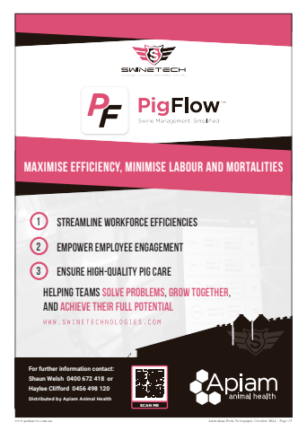 www.porknews.com.au Australian Pork Newspaper, October 2024 %u2013 Page 15MAXIMIsE EFFICIENCY, MINIMIsE LABOuR AND MORTALITIES1 STREAMLINE WORKFORCE EFFICIENCIES2 EMPOWER EMPLOYEE ENGAGEMENT3 ENSURE HIGH-QUALITY PIG CARE HELPING TEAMS SOLVE PROBLEMS, GROW TOGETHER, AND ACHIEVE THEIR FULL POTENTIALFor further information contact:Shaun Welsh 0400 672 418 or Haylee Clifford 0456 498 120Distributed by Apiam Animal HealthSCAN ME