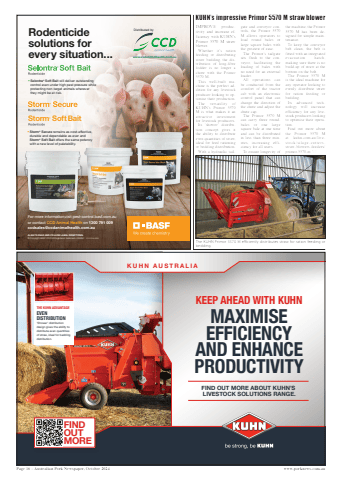 Page 16 %u2013 Australian Pork Newspaper, October 2024 www.porknews.com.auIMPROVE productivity and increase efficiency with KUHN%u2019s Primor 5570 M straw blower.Whether it%u2019s ration feeding or distributing straw bedding, the distribution of long-fibre fodder is no longer a chore with the Primor 5570 M.This well-built machine is the perfect addition for any livestock producer looking to optimise their production.The versatility of KUHN%u2019s Primor 5570 M is what makes it an attractive investment for livestock producers.Its %u2018shower%u2019 distribution concept gives it the ability to distribute even quantities of straw, ideal for feed rationing or bedding distribution.With a hydraulic tailgate and conveyor controls, the Primor 5570 M allows operators to load round bales or large square bales with the greatest of ease.The Primor%u2019s tailgate sits flush to the conveyor, facilitating the loading of bales with no need for an external loader.All operations can be conducted from the comfort of the tractor cab with an electronic control panel that can change the direction of the chute and adjust the chute cap.The Primor 5570 M can carry three roundbales or one large square bale at one time and can be distributed in less than three minutes, increasing efficiency for all users.To ensure longevity of the machine, the Primor 5570 M has been designed for simple maintenance.To keep the conveyor belt clean, the belt is fitted with an integrated evacuation hatch, making sure there is no build-up of straw at the bottom on the belt.The Primor 5570 M is the ideal machine for any operator looking to evenly distribute straw for ration feeding or bedding.Its advanced technology will increase efficiency for any livestock producers looking to optimise their operation.Find out more about the Primor 5570 M at kuhn.com.au/livestock/silage-cuttersstraw-blowers-feeders/primor-5570-m KEEP AHEAD WITH KUHNMAXIMISE EFFICIENCY AND ENHANCE PRODUCTIVITYFIND OUT MORE ABOUT KUHN%u2019S LIVESTOCK SOLUTIONS RANGE.FINDOUTMOREKUHN AUSTRALIATHE KUHN ADVANTAGEEVEN DISTRIBUTION%u2018Shower%u2019 distribution design gives the ability to distribute even quantities of straw, ideal for bedding distribution. %ufffd Selontra%u00ae Soft Bait will deliver outstanding control even under high pest pressure while protecting non-target animals wherever they might be at risk.%ufffd Storm%u00ae Secure remains as cost-effective, durable and dependable as ever and Storm%u00ae Soft Bait offers the same potency with a new level of palatability.Storm Soft BaitDistributed bywww.ccdanimalhealth.com.auFor more information,visit pest-control.basf.com.au or contact CCD Animal Health on 1300 791 009 ccdsales@ccdanimalhealth.com.auALWAYS READ AND FOLLOW LABEL DIRECTIONS.%u00a9 Copyright BASF 2023 %u00ae Registered trademark of BASF. 213735 04.2023Rodenticide solutions for every situation...KUHN%u2019s impressive Primor 5570 M straw blowerThe KUHN Primor 5570 M efficiently distributes straw for ration feeding or bedding.