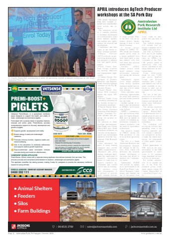 Page 4 %u2013 Australian Pork Newspaper, October 2024 www.porknews.com.auTHE South Australian Pork Day brought to- gether key stakeholders from across the in- dustry.The afternoon served as a valuable platform to exchange information on current projects, learn about industry updates and explore new opportunities for research and development.Contributors and their topics at the recent industry seminar included:%u2022 Megan Edwards (ACE Livestock) on prefarrowing feeding strategies designed to enhance sow and piglet performance%u2022 Sally Tritton (SunPork Group) reviewed pig feeding behaviour and management implications%u2022 Chelsea Dosset (Department of Primary Industries and Regions, South Australia) updated attendees on the Pig Biosecurity Project%u2022 Tanya Pittard (Australian Pork Limited) shared the latest APL updates%u2022 Robyn Tucker (Leap Consulting) presented on the recently revised environmental guidelines%u2022 Sharon Starick (Kongolia Farms) discussed Australian Pork Industry Quality Assurance Program updates and preparing for on-farm inspections.In addition to these excellent presentations, John Pluske and Charlie Rikard-Bell gave South Australian producers an overview on the latest research and development initiatives from the Australasian Pork Research Institute.John presented the latest in creep feeding strategies and current APRIL funded projects.Research into creep feeding strategies highlights the importance of gradually introducing piglets to solid food to improve digestive development and overall growth rates at weaning.To optimise creep feed consumption, it is advised to provide small, frequent portions of creep (around 200g) to the litter over an extended period, ideally starting at least 14 days before weaning.A recent project funded by APRIL (7C006) found pre-weaning piglets given creep in a larger pelleted form were more likely to play and interact with feed over those that received smaller pellets.Another APRIL funded project found larger pelleted creep encouraged consumption during the lactation phase.Additionally, piglets given larger pelleted creep during lactation displayed higher feed intake and growth intake post weaning.These outcomes show promising opportunities for creep feed optimisation and further research into this field.Another update in research and development is APRIL%u2019s involvement with AgTech.APRIL%u2019s communication and extension manager, Dr Charlie RikardBell, gave an update on a series of workshop opportunities designed to connect producers with the latest in Agricultural technologies.This initiative, funded by PIRSA, invites SA Pork producers to join in on all three upcoming events.The first is a South Australian Research and Development Institute led webinar in late October 2024, which will showcase the research behind developing a real-time pen device to monitor sow%u2019s reproductive status.Additionally, SARDI will provide an update on its involvement in the Fight Food Waste Cooperative Research Centre project and whether the use of bio-secure food waste could be integrated into pig feed in the future.The AgTech program will include two inperson workshops led by APRIL early next year.The first, in February 2025, led by Dr Sophia Ward, will provide updates on APRIL%u2019s involvement in the Tails CRC project aimed at identifying what risk factors contribute to tail biting behaviour on Australian farms.Using observations made on over 75,000 pigs across SunPork Group and Rivalea Australia sites, a decision support tool will be made available to producers so units can be evaluated for tail biting risk.The aim of this support tool will be to allow producers to proactively manage and mitigate tail biting using Australianspecific data.The second in-person workshop, led by Dr Charlie Rikard-Bell, will demonstrate how to sample grain for near-infrared radiation analysis using AusScan online technology.The workshop will provide an overview into uploading scans to the AusScan platform and will include a nutritionist%u2019s perspective on how to apply the online technology for assessment of grain quality parameters.Future applications of NIR, such as the miniaturisation of the NIR spectrometer to allow grain to be sampled using handheld devices, will also be discussed.For further information, or to register for any of the Pork SA producer group workshops, please contact Dr Charlie Rikard-Bell at c.rikardbell@april.org.au | 08 8531 2700 | sales@jacksonsaustralia.com | jacksonsaustralia.com.au%u2022 Animal Shelters%u2022 Feeders%u2022 Silos%u2022 Farm BuildingsDr Charles Rikard-Bell introducing a series of upcoming AgTech producer workshops at the South Australian Pork Day.APRIL introduces AgTech Producer workshops at the SA Pork DayCONVENIENT DOSING APPLICATORPremi-Boost+ 250mL comes with a separate dosing applicator that delivers precisely 2mL per dose. This ensures accurate and convenient administration to newborn, underweight and premature piglets.The applicator simplifies the dosing process, making it easy for caregivers to provide the necessary nutritional support to young animals.DOSE RATE PACK SIZE: 250MLONE PUMP = 2ML2mL: Newborn, underweight and premature piglets soon after birth.Repeat the following day if necessary.For any remaining product, reapply the original bottle cap and store in a cool/dry place for up to 3 months.Rinse and clean trigger prior to reusing.SHAKE WELL BEFORE USESupports growth, development and vitalityBoosts energy in weak and underweight newbornsPromotes immune function, digestive health and overall wellbeingAids in the prevention of nutritional deficiencies and supports optimal growth trajectoriesEasy-to-administer paste formulation ensures accurate dosing and maximum effectiveness.REBECCA JAMIESON - SWINE KEY ACCOUNT MANAGER0400 392 111DISTRIBUTED BY:PREMI-BOOST+PIGLETSVetsense Premi-Boost+ is a specialised nutritional paste designed to support the health and vitality of weak, underweight and premature p