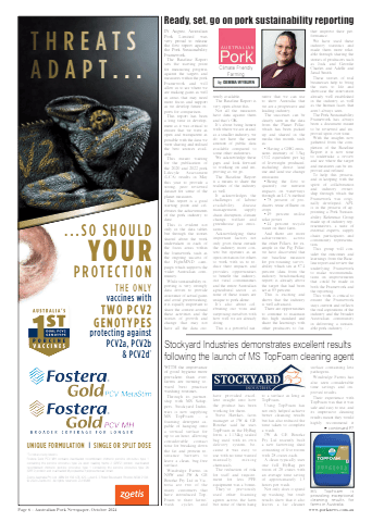 Page 6 %u2013 Australian Pork Newspaper, October 2024 www.porknews.com.auWITH the importance of good hygiene more prevalent than ever, farms are turning toward best practice washing routines.Through its partnership with MS Schippers, Stockyard Industries is now supplying MS TopFoam %u2013 a foaming detergent capable of hanging onto a vertical surface for up to an hour, allowing considerable contact time for breaking down the fat and protein resistance barriers to leave a clean, bug-free surface.Windridge Farms in NSW and JW & GE Bourke Pty Ltd in Victoria are two of the many customers that have introduced TopFoam to their farms%u2019 wash cycles and have provided excellent insight into how the product has been working for them.Steve Hawkes, farm manager at JW & GE Bourke said he uses TopFoam in the HyBag form, a 1.134kg sealed bag used with its own delivery system, because it was easy to use with no time wasted manually mixing chemicals.The reduction of risk for staff and requirement for less PPE equipment was a bonus.They%u2019ve previously used other foaming agents across the farm but none of them hang to a surface as long as TopFoam.Using TopFoam has not only helped achieve better cleaning results but has also reduced the time taken to complete a wash.JW & GE Bourke Pty Ltd recently built a new farrowing shed consisting of five rooms with 28 crates each.A clean typically uses one full HyBag per room of 28 crates with an average time saving of approximately 1.5 hours per wash.Not only does it speed up washing, but swab results show that it also leaves a far cleaner surface containing less pathogens.Windridge Farms has also seen considerable time savings and improved results.Their experience with TopFoam was that it was safe and easy to use, and its impressive cleaning results meant they would highly recommend it IN August, Australian Pork Limited was very proud to release the first report against the Pork Sustainability Framework.The Baseline Report sets the starting point for measuring progress against the targets and measures within the pork Framework and will allow us to see where we are making gains as well as areas that may need more focus and support as we develop future reports for comparison.This report has been a long time in development as it was critical to ensure that we were as open and transparent as possible with the data we were sharing and utilised the best sources available.This meant waiting for the publication of the 2020 and 2022 pork Lifecyle Assessment (LCA) results in May this year to provide a strong, peer reviewed dataset for some of the planet measures.This report is a good starting point and celebrates the achievements of the pork industry to date.This is evident not only in the data tables but through the stories shared about the work undertaken in each of the focus areas within the framework, such as the ongoing success of the FightMND campaign which supports the wider Australian community.While sustainability reporting is very strongly data driven to provide assurance of actual gains and avoid greenwashing, it is equally important to share the context around these activities and the stories of growth and change that may not have all the data currently available.The Baseline Report is very open about this.Not all the measures have data against them and that%u2019s OK.It%u2019s about being honest with where we are at and, as a smaller industry, we do not have the same amount of public data available compared to some other industries.We acknowledge these gaps and look forward to working on and improving as we go.The Baseline Report is a means to share the realities of the industry as well.It acknowledges the challenges of labour availability, disease management, supply chain disruption, climate change, welfare and greenhouse gas emissions.Acknowledging these important factors not only gives those outside the industry more context but operates as an open invitation for others to work with us to reduce their impacts and provides opportunities to benefit the industry, our rural communities and the entire Australian agricultural sector - as none of these issues are unique to pork alone.It%u2019s also about celebrating our wins and surprising ourselves with how well we are already doing.This is a powerful narrative that we can use to show Australia that we are a progressive and leading industry.The successes can be clearly seen in the data from the Planet Pillar, which has been picked up and shared in the media this month, such as:%u2022 Having a GHG emissions intensity of 3.3kg CO2 equivalent per kg of liveweight produced, including direct land use and land use change emissions %u2022 Being the first to quantify our nutrient impacts on waterways through an LCA method %u2022 78 percent of producers reuse effluent on crops %u2022 49 percent utilise solar power %u2022 44 percent recycle water on their farm.And there are more achievements across the other Pillars, for example in the Pig Pillar, we have discovered that our baseline measure for pre-weaning survivability which sits at 87.4 percent (data from the industry benchmarking report) is already above the target that had been set at 85 percent.This is exciting and shows that the industry is well advanced.There are opportunities to continue to maintain this high standard and share the learnings with other producers to further improve their performance.We have used these industry statistics and made them more relatable through sharing the stories of producers such as Jock and Geordie Charles and Adelle and Jarad Smith.These stories of real businesses help to bring the stats to life and showcase the innovation already well established in the industry, as well as the human faces that aren%u2019t always seen.The Pork Sustainability Framework has always been a document meant to be reviewed and improved upon over time.With the insights now gathered from the completion of the Baseline Report it is now time to undertake 