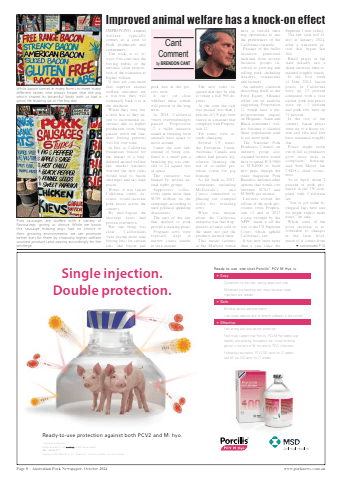 Page 8 %u2013 Australian Pork Newspaper, October 2024 www.porknews.com.auIMPROVING animal welfare typically comes at a cost to both producers and consumers.The trick is to always first convince the buying public of the intrinsic value proposition of the transition to higher welfare.If they are convinced that superior animal welfare outcomes are a win-win, they will eventually back it in at the checkout.While they may buy a little less as they adjust to incremental increases due to higher production costs being passed down the line, their buying patterns will lift over time.In July, as California businesses braced for the impact of a longdelayed animal welfare law, market watchers worried the new rules would lead to bacon shortages and sky-high prices.Worse, it was feared California voters%u2019 decision would increase pork prices across the country.By mid-August the shortage fears had proven overblown.But one thing was clear - Californians were paying more (and buying less) for certain cuts like bacon and pork loin at the grocery store.It isn%u2019t yet clear whether these trends will persist in the long term.In 2018, California voters overwhelmingly passed Proposition 12, a ballot initiative aimed at ensuring farm animals have space to move around.Under the new law, instead of being confined to a small pen a breeding pig was entitled to 24 square feet of space.The initiative was backed by several animal rights groups.Supporters collectively spent more than $US9 million on the campaign, according to state political spending disclosures.The part of the law that applied to pork proved a sticking point.Pregnant sows were typically kept in narrow crates, unable to turn around.The new rules required that they be able to rotate a full 360 degrees.At the time the rule was passed, less than 1 percent of US pigs were reared in a manner that complied with Proposition 12.Yet times were already changing.Several US states, the European Union, Australia, Canada and others had passed legislation banning the use of so-called gestation crates for pig housing.As far back as 2012, companies including McDonald%u2019s and Costco committed to phasing out cramped stalls for breeding sows.What was unique about the California initiative was that it applied to all meat sold in the state, not just the products farmed there.This meant farmers in the Midwest would have to retrofit their hog operations to suit the preferences of the California clientele.Passage of the ballot initiative generated backlash from several business groups involved in growing and selling pork, including retailers, restaurants and farmers.An industry coalition describing itself as the Food Equity Alliance rolled out an analysis suggesting Proposition 12 would have a disproportionate impact on Hispanic, Asian and Black consumers%u2019 wallets because it claimed those populations tend to eat more pork.The National Pork Producers Council, an industry group, also claimed farmers would have to spend $US3000 to $US4000 to build new pens, though the trade magazine Pork Business outlined other options that would cost between $US17 and $US600 per animal.Lawsuits slowed the rollout of the pork provisions from Proposition 12 and in 2023 a case brought by the NPPC made it all the way to the US Supreme Court, which upheld California%u2019s law.It has now been more than a year since the Supreme Court ruling.The law took full effect in January 2024, after a transition period that began last July.Retail prices in the state initially saw a sharp increase, then remained roughly steady.In the first week of June 2024, bacon prices in California were up 25 percent compared with a year earlier, pork loin prices were up 1.3 percent and pork ribs were up 31 percent.In the rest of the country, bacon prices were up to a lesser extent and ribs and loin have remained roughly flat.Prices might settle out or fall as producers grow more hogs in compliant housing, said Seth Meyer, the USDA%u2019s chief economist.As of April, about 2 percent of pork produced in the US complied with California law.%u201cYou%u2019ve got some biological lags here and we might expect more noise,%u201d he said.While some of the price increase is attributable to changes at the farm level, much of it comes from Single injection. Double protection.%u2022 Easy- Convenient for the user, saving labour and time.- Minimises pig handling and stress because fewer injections are needed.%u2022 Safe- Minimal serious adverse events.- Low tissue reaction and no growth setbacks in the nursery.%u2022 Effective - Fast-acting and long-lasting protection.- Field trials support that Porcilis%u00ae PCV M Hyo keeps pigs healthy and growing throughout the critical fi nishing period in the face of M. hyo and/or PCV2 infections.- Following vaccination, PCV2 DOI lasts for 22 weeks and M. hyo DOI lasts for 21 weeks.Ready-to-use protection against both PCV2 and M. hyo.Ready-to-use, one-shot Porcilis%u00ae PCV M Hyo is:%u00ae Registered trademarks. Intervet Australia Pty Ltd (trading as MSD Animal Health). ABN: 79008467034. Copyright %u00a9 2024 Merck & Co., Inc., Rahway, NJ, USA and its a%u009b liates. All rights reserved.Pork sausages are stuffed with a variety of flavourings, giving us choice. While we know the %u2018sausage making pigs%u2019 had no choice in their growing environments, we can promote better lives for them by choosing higher welfare sourced products and paying accordingly for the privilege.Improved animal welfare has a knock-on effectCantComment by BRENDON CANTWhile bacon comes in many forms to meet many different tastes, one always hopes that the pig which shared its bountiful body with us had a good life leading up to the big day.* continued P10
